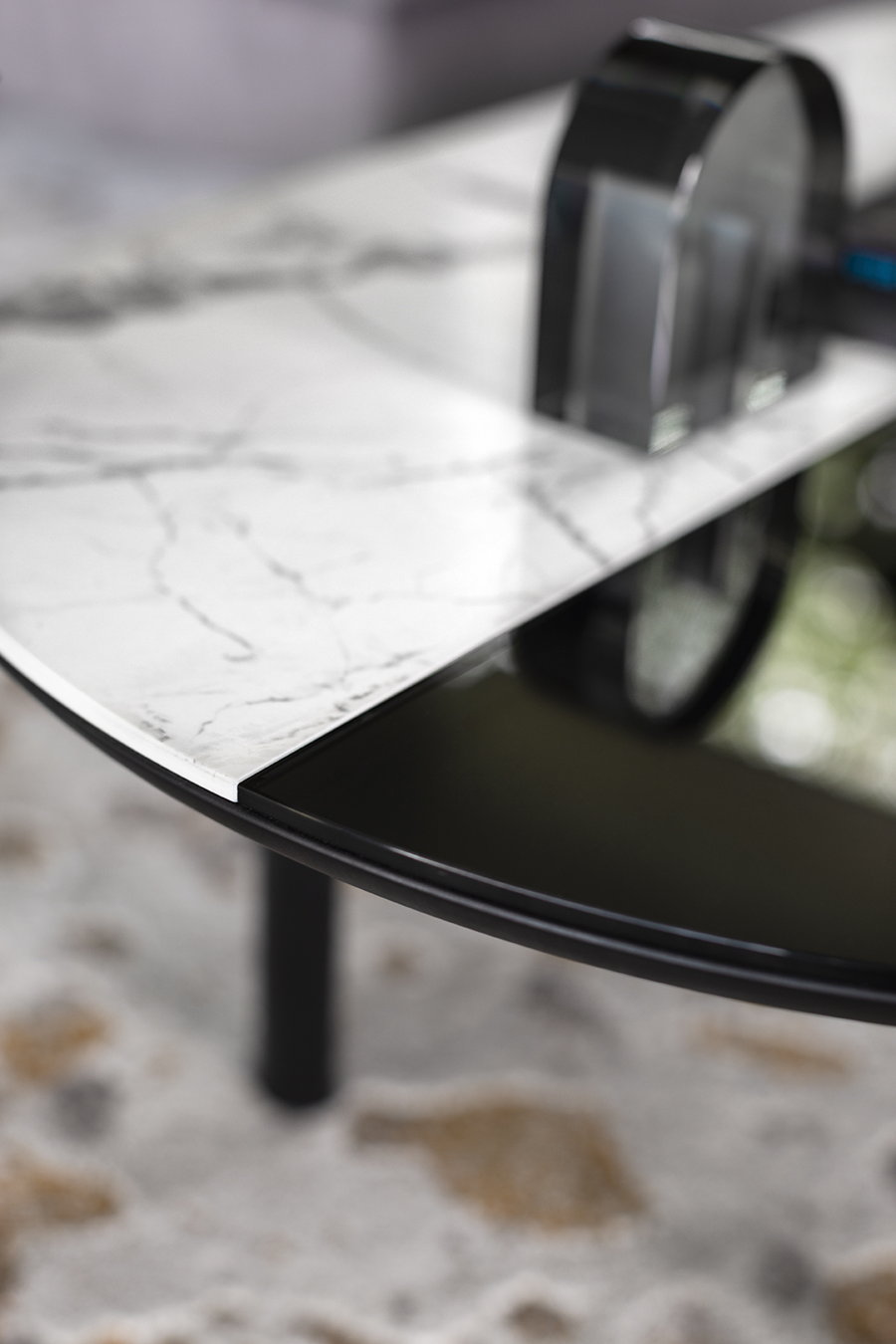Размеры: 110 х 60 х H32 см; материалы: ясень, топ – керамика/стекло; особенности: топ состоит из 2х материалов.